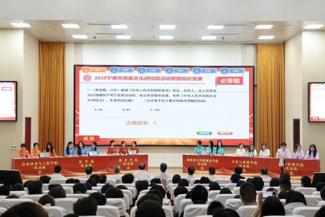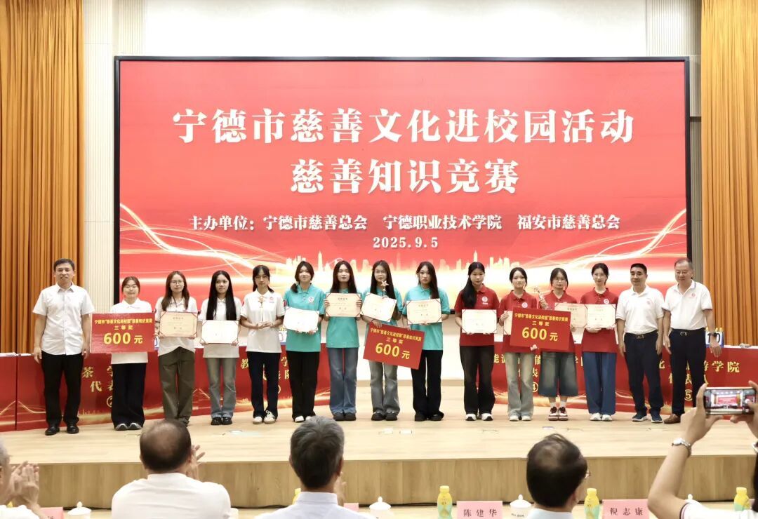 9月5日,正值第十個“中華慈善日”暨新修訂《中華人民共和國慈善法》實施一周年到來之際,由寧德市慈善總會、寧德職業(yè)技術學院、福安市慈善總會聯合主辦的2025年寧德市“慈善文化進校園”慈善知識競賽活動在寧德職業(yè)技術學院舉行。寧德市政協黨組書記、主席蘭斯琦,寧德市慈善總會會長林鴻,寧德職業(yè)技術學院黨委書記陳建華,寧德市慈善總會副會長凌慶賢、倪志康,寧德職業(yè)技術學院副校長黃重、紀委書記陳麗銀,福安市慈善總會會長林慶枝、副會長陳智等領導嘉賓及寧德職業(yè)技術學院領導、師生代表500多人參與活動。